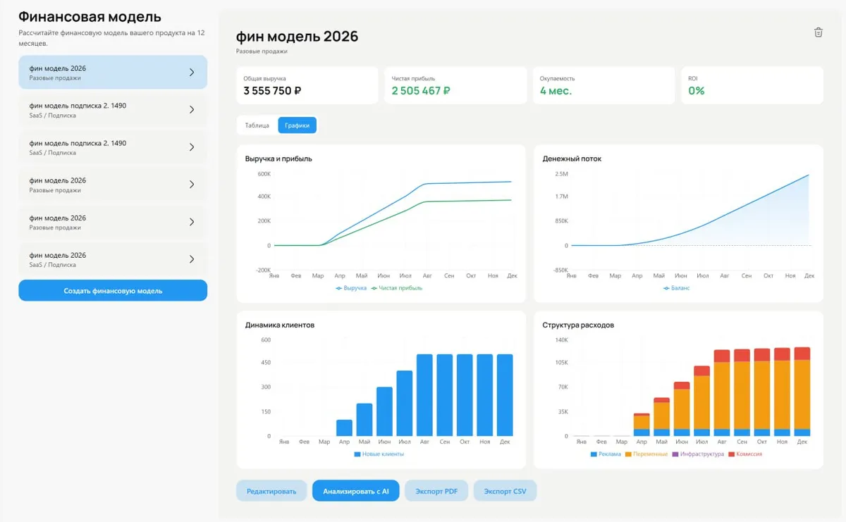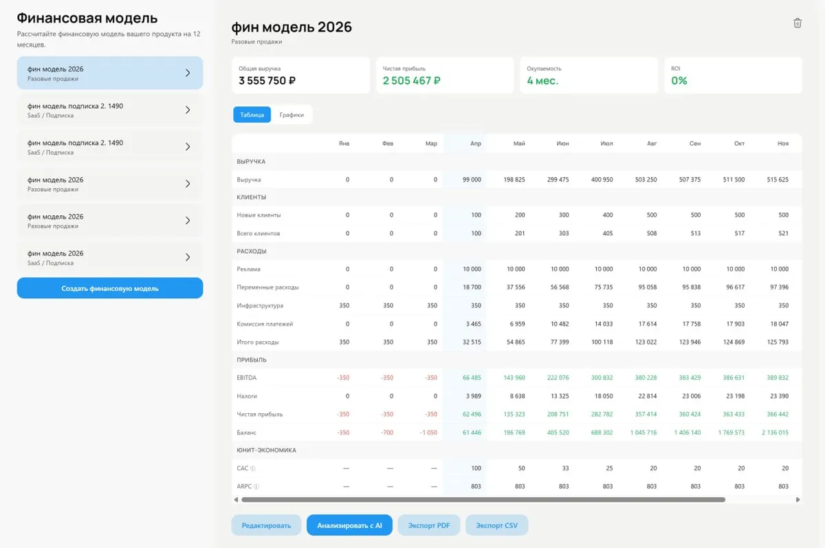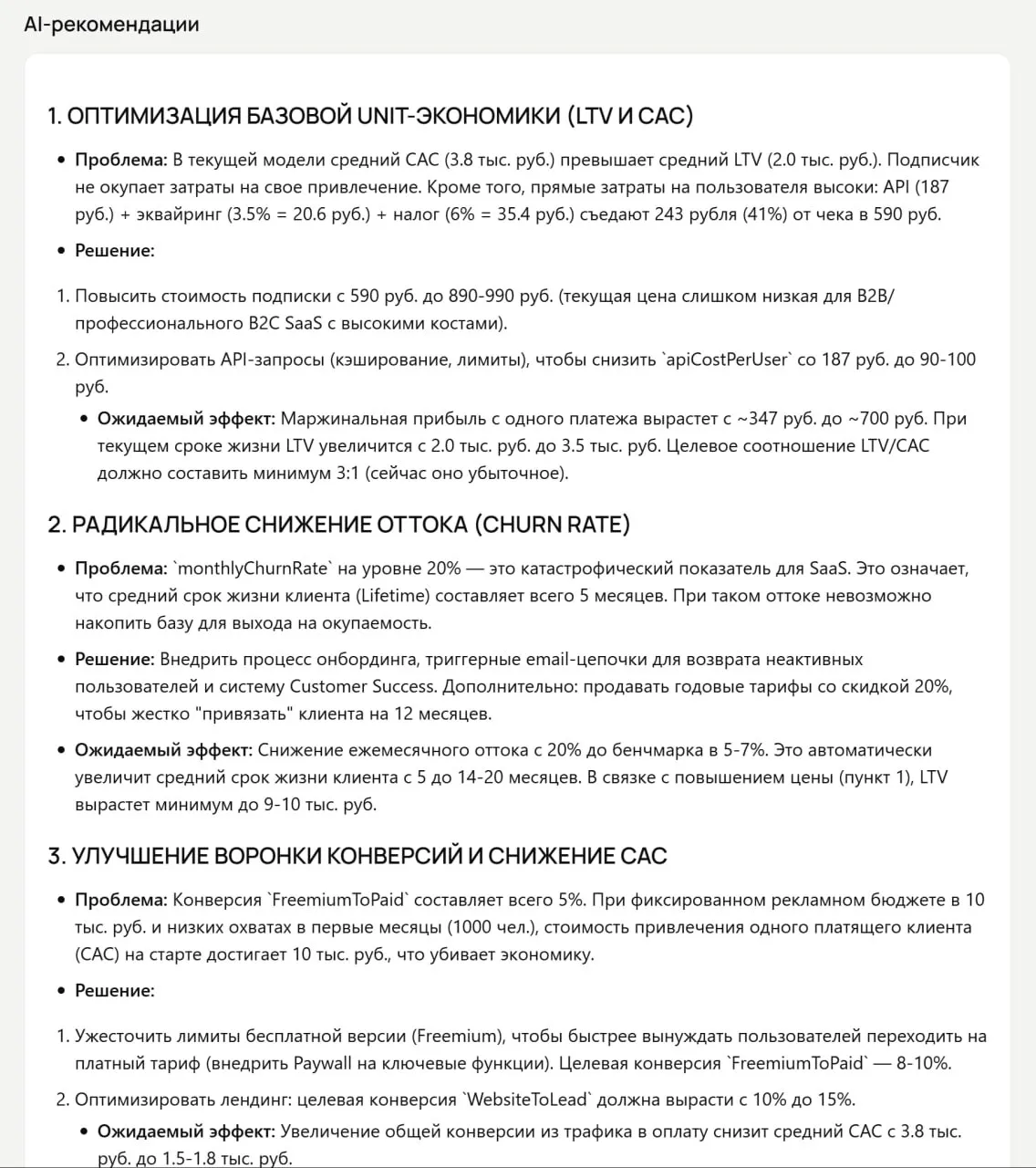 С помощью этого инструмента я узнал, что моя первичная фин модель была убыточной и нужно было что-то менять, встроенная нейронка дала рекомендации, но лучшим решением было просто поменять бизнес модель, от подписки к разовым платежам.